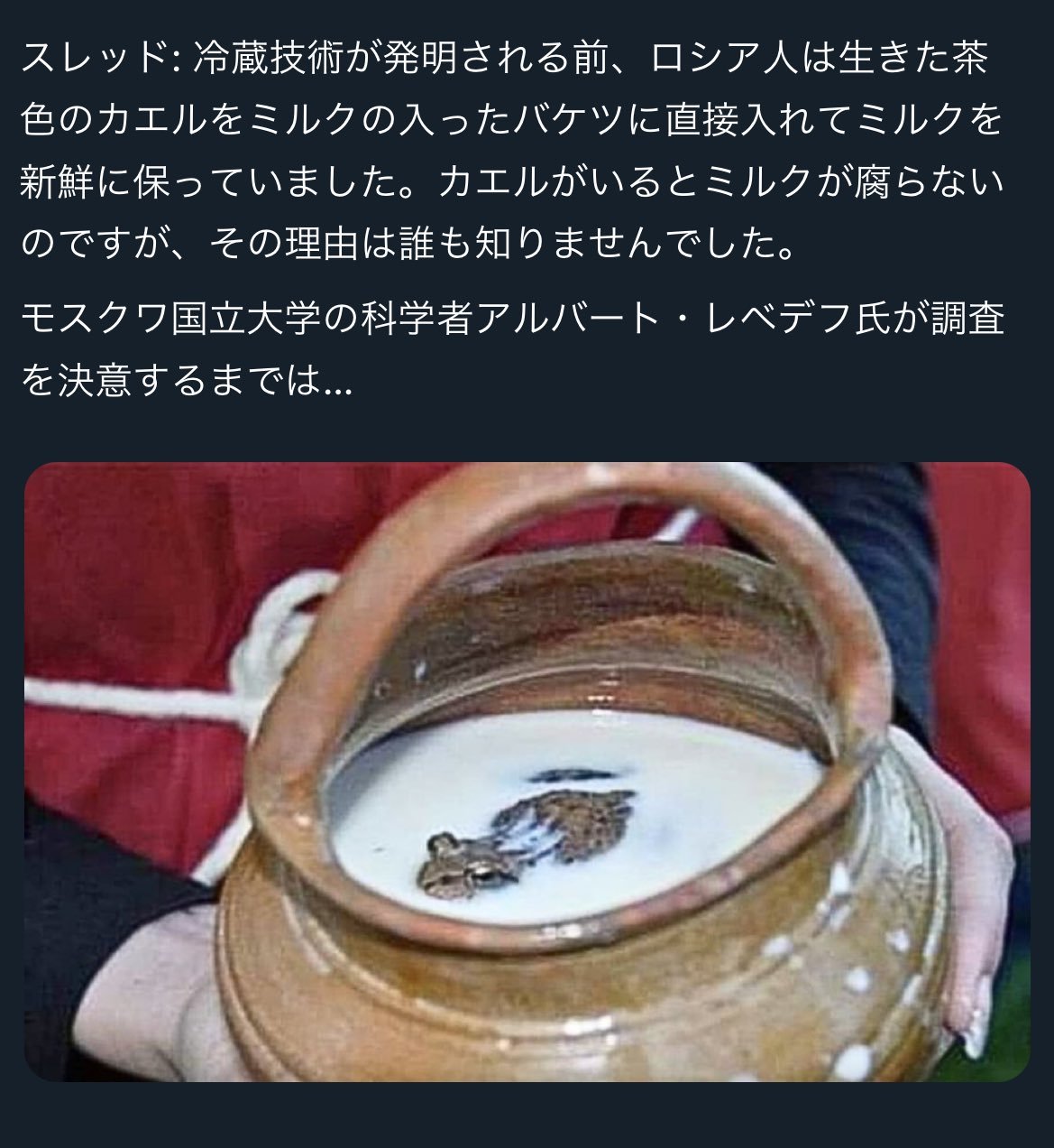 | … | 5726/02/27(金)16:24:17No.1406048099+アメリカは工場でカエルから抽出した抗生物質でミルクの鮮度を保った |