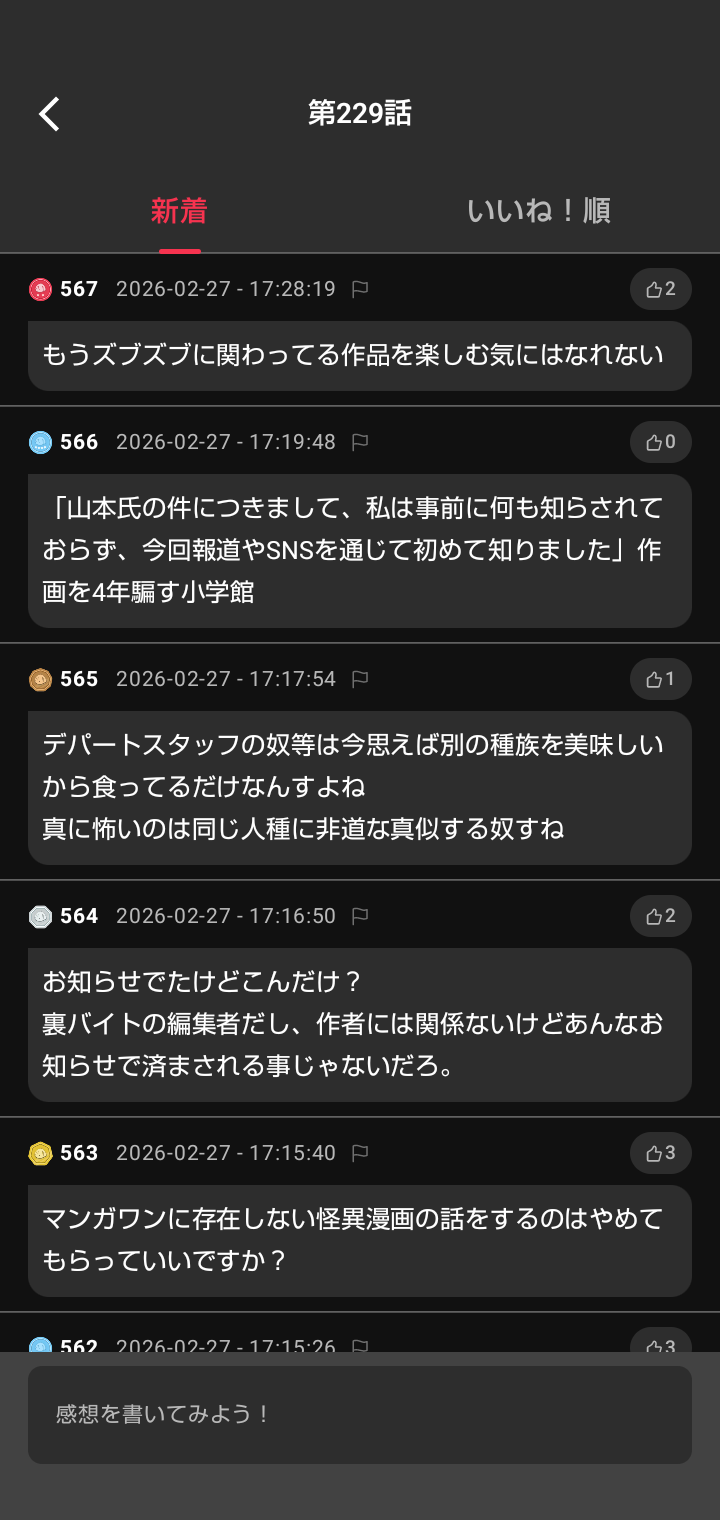 | … | 95226/02/27(金)17:41:51No.1406064066そうだねx2小学館がー!!とか主語デカくするよりマンガワンが明らかに編集部としてヤバいことしてることに集中させたほうがいいと思うけどな |