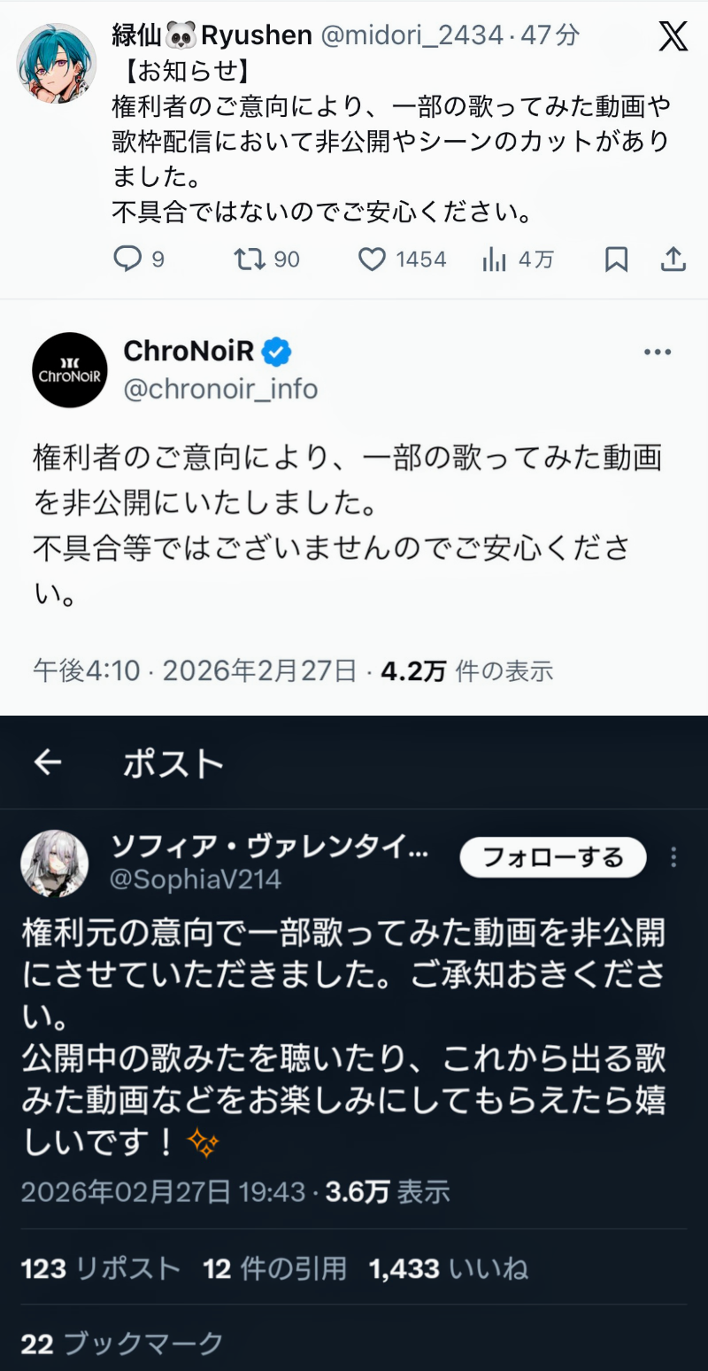 | … | 2326/02/27(金)20:59:41 ID:mvTK/hCMNo.1406134733そうだねx4…まさか歌ってみた動画なりカラオケなりやるのに許可とか取ってなかったみたいな話なの? |