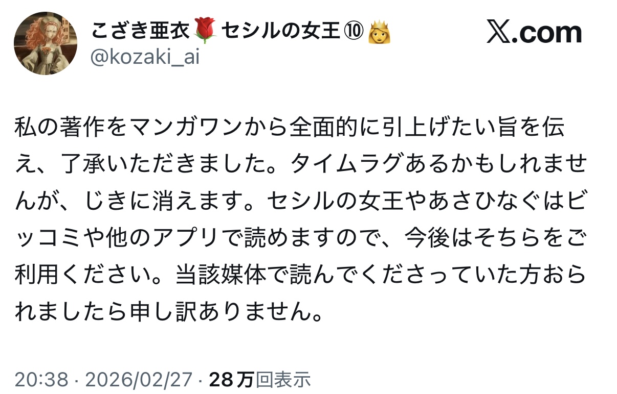 | … | 4326/02/27(金)21:42:27No.1406157219そうだねx4セシルの女王の作者がマンガワンから自作引き上げるって声明出したな |