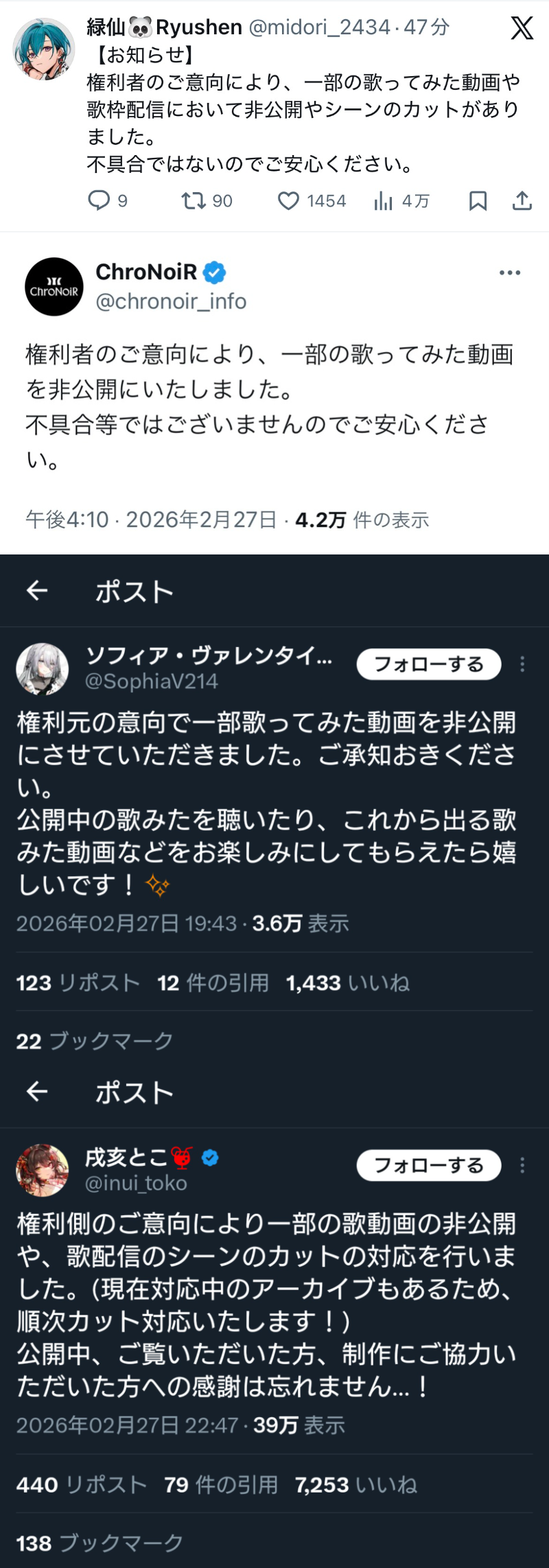 | … | 5026/02/28(土)00:41:35No.1406236552+>葛葉と叶には本人らにポストさせずにユニット垢でスタッフがやって他のライバーは本人にポストさせるのまさに最近騒がれてる優遇だなぁって感じ |