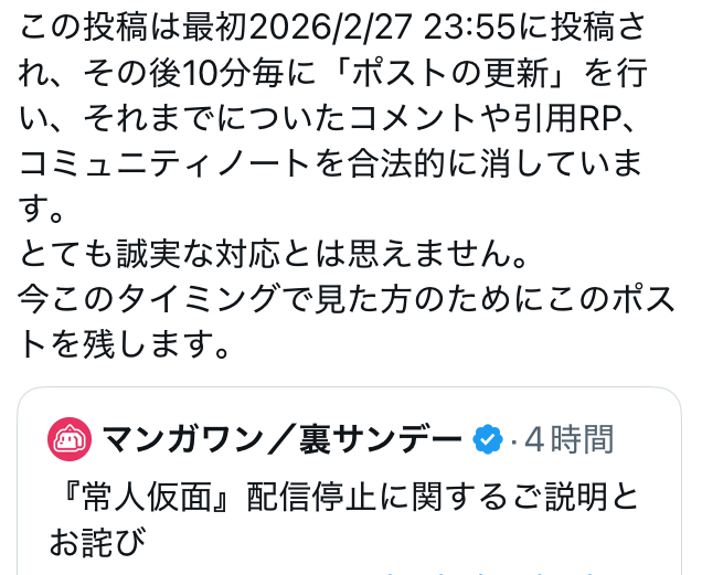 | … | 81026/02/28(土)06:09:02No.1406267319そうだねx1>つまりまだマンガワンから離れてない作家は犯罪行為を肯定してるってことでいいんだよな? |