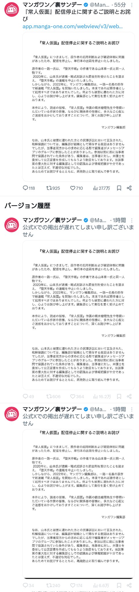 | … | 77126/02/28(土)05:48:26No.1406266661+>マンガワンさん怒りのポスト更新連打で批判コメント削除 |