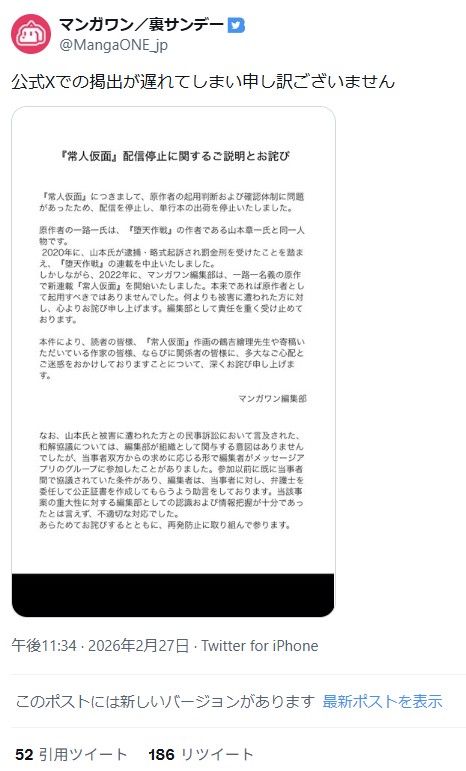 | … | 1026/02/28(土)06:39:43No.1406268499そうだねx16あくまで常人仮面配信停止のお詫びで検索やニュースにでるようにしてるし |