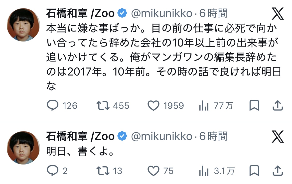 | … | 1726/02/28(土)08:10:10No.1406275308+めちゃくちゃ作家に逃げられ始めてるけどこれから来るはずだった志望者も逃すことになるしかなりダメージ受けてそう |