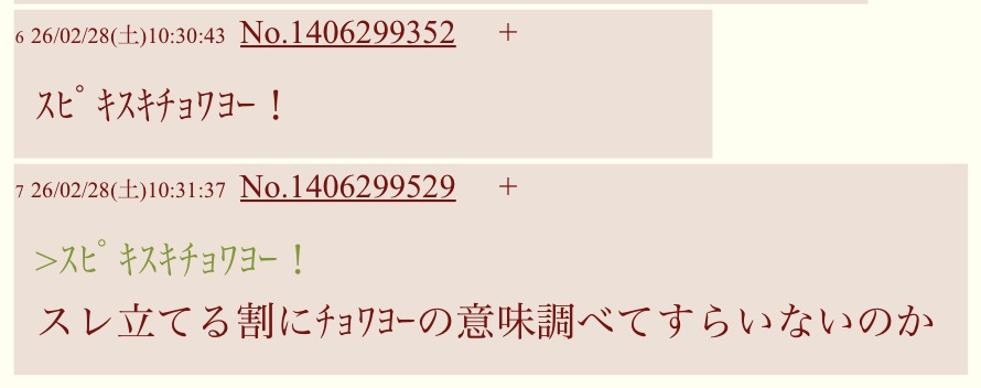 | … | 726/02/28(土)10:31:37No.1406299529そうだねx13>スピキスキチョワヨー! |
