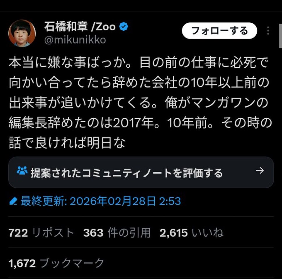 | … | 95526/02/28(土)21:16:45No.1406482731そうだねx3>前編集長のX投稿が削除されてるけど一体なにを書いてたんだ |