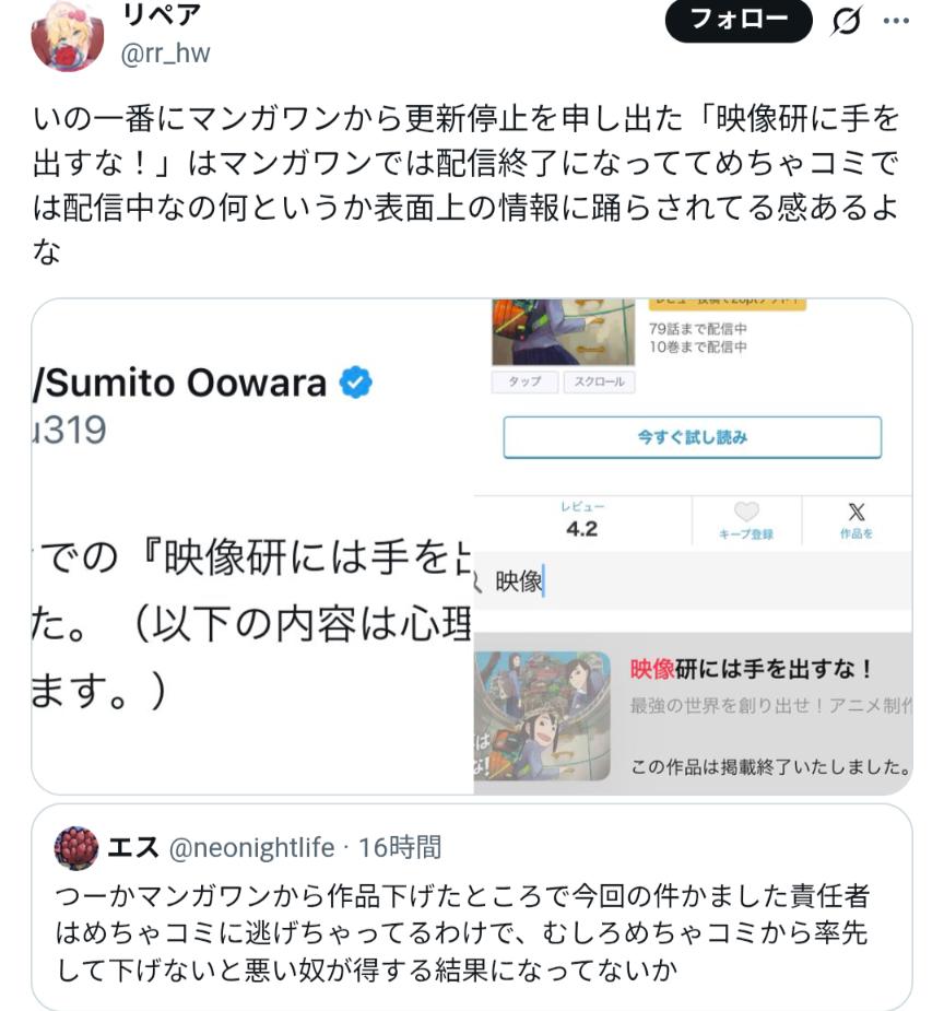 | … | 97326/03/01(日)09:10:42No.1406614591そうだねx1>マンガワンの声明って上まで精査してあの文章なの… |