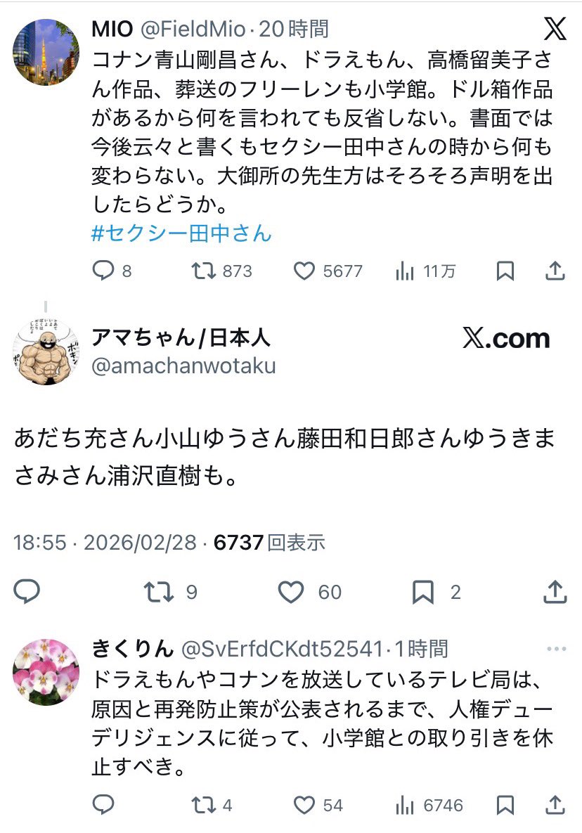 | … | 4526/03/01(日)07:15:37No.1406597394そうだねx2なんか小学館は不祥事多くない? |