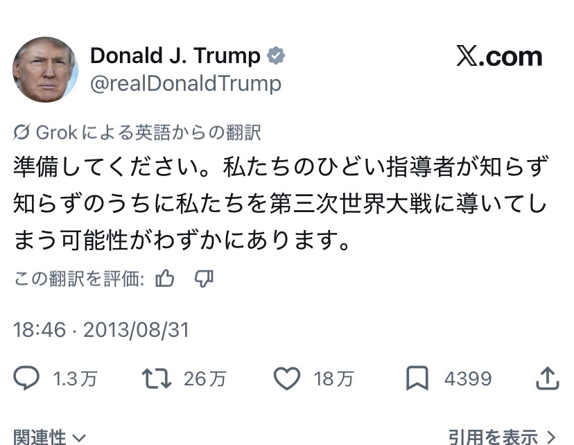 | … | 1526/03/01(日)08:18:50No.1406602534+そもそもトランプ自身過去に自分が大統領なんかになったらえらいことだぞって言ってたような |