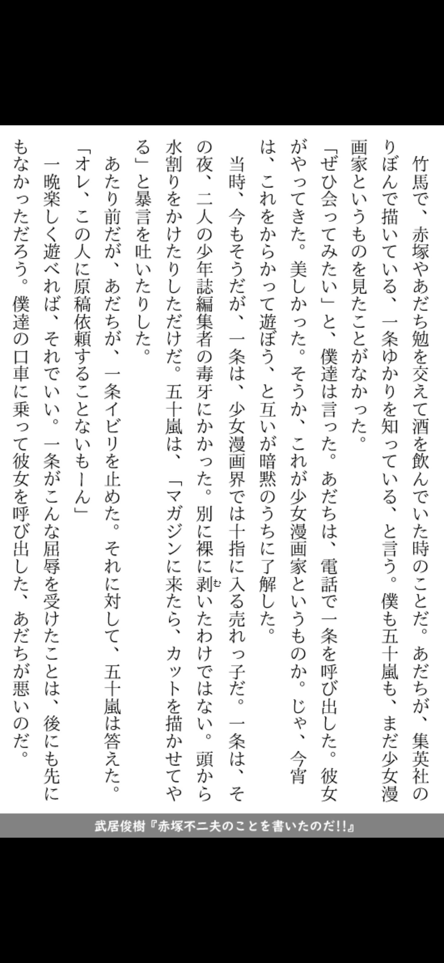 | … | 10226/03/01(日)10:26:49No.1406635358+>赤塚は酒と面白いに取り憑かれて寿命縮めて死んだようなもんだから周りの誰か止めてやる奴いなかったのかな |