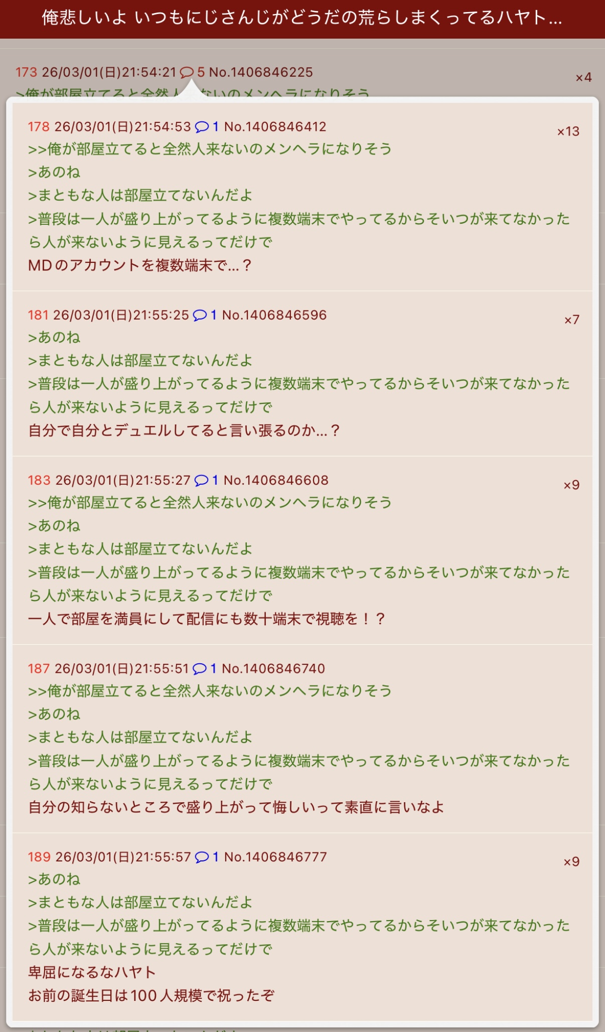 | … | 47826/03/02(月)00:06:52No.1406893443そうだねx1>MDスレに出入りしてVtuber粘着してるハヤトのお友達なのを忘れたのか |