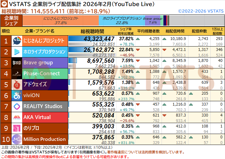 | … | 2326/03/02(月)12:10:14No.1406976736+にじは枠数や配信時間の割に平均視聴者や1万超えてる枠が他所より少ないように読み取れるけど |