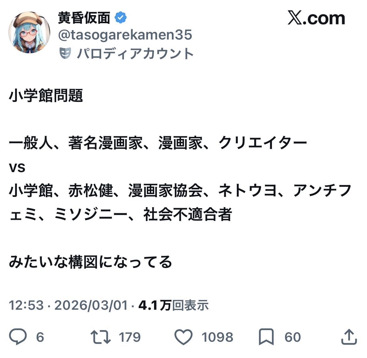 | … | 3026/03/02(月)14:51:02No.1407015906そうだねx4「性犯罪者に漫画を描く資格はない!」って話をすると |
