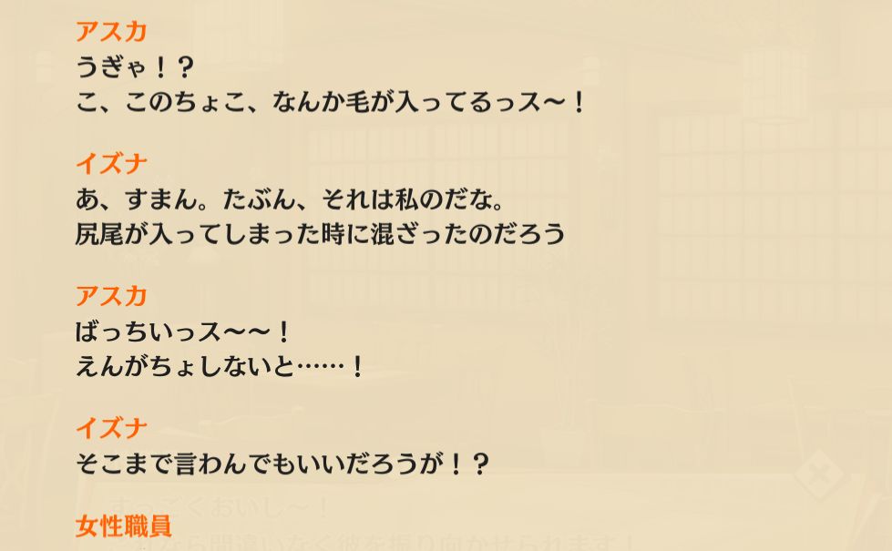 | … | 2626/03/02(月)19:42:22No.1407091033+>イズナちゃんって料理する時に自分の毛が入る事を問題に思ってないんスよね…バレンタインヒエンだったかっス |