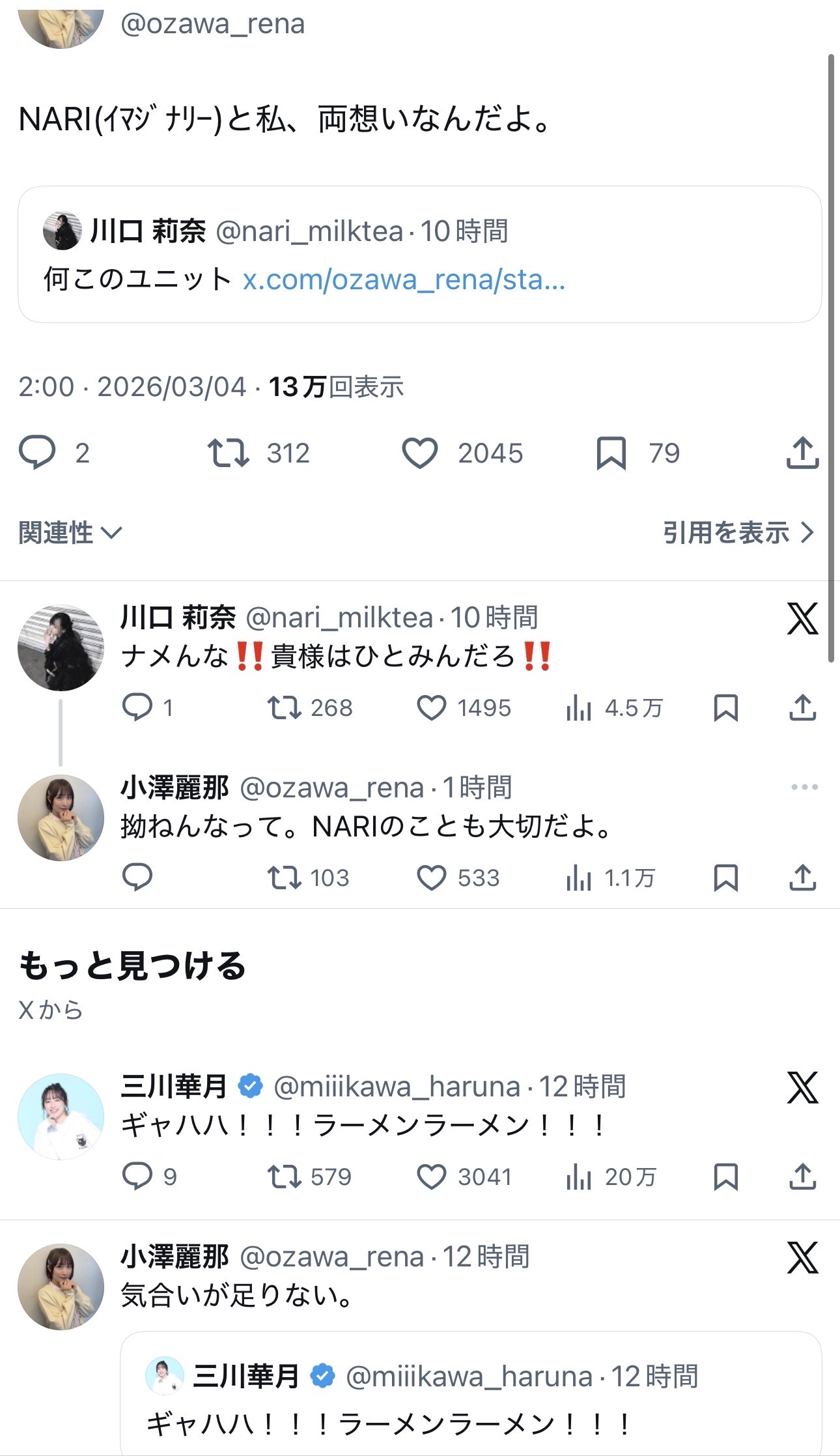 | … | 7826/03/04(水)12:51:34No.1407588116+>https://x.com/ozawa_rena/status/2029024293238297028 |