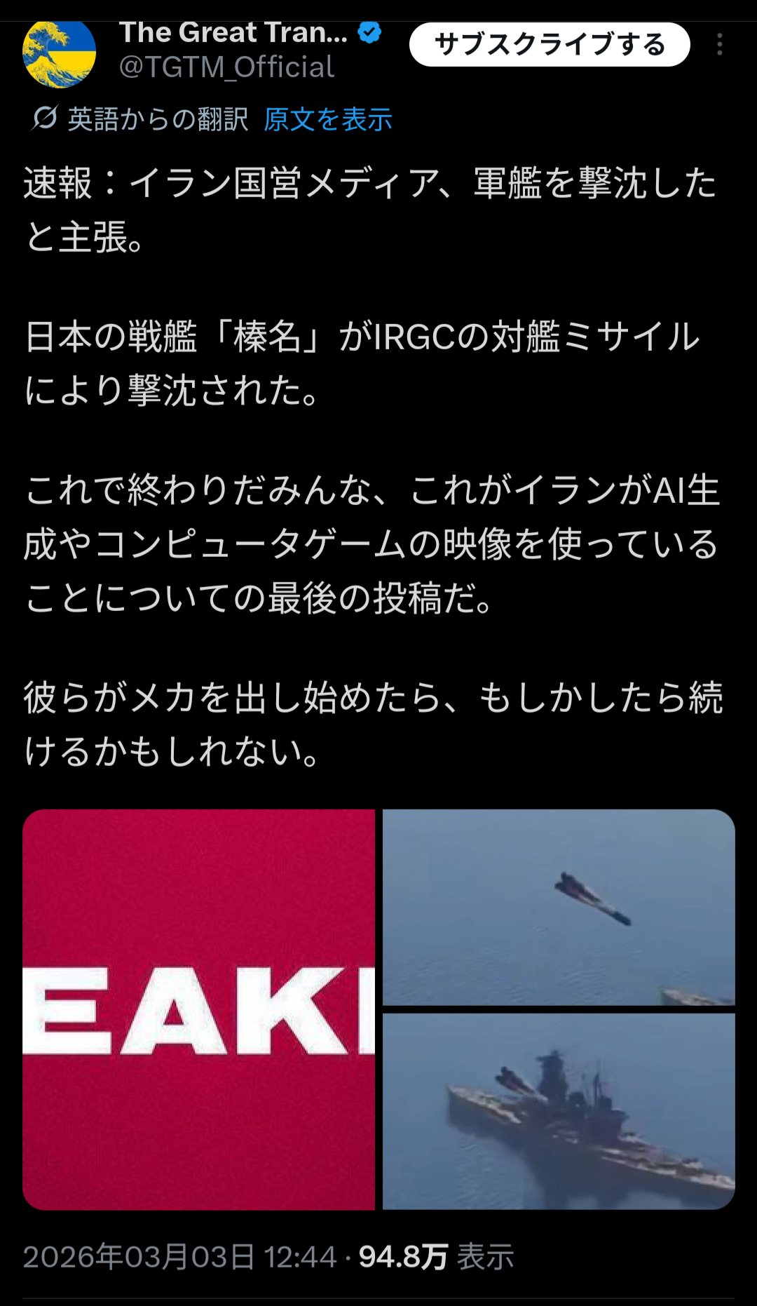 | … | 10526/03/04(水)18:33:16No.1407661905+素人には艦とミサイルの型や製造国なんてパッと一目でわからないという前提があるにしても |