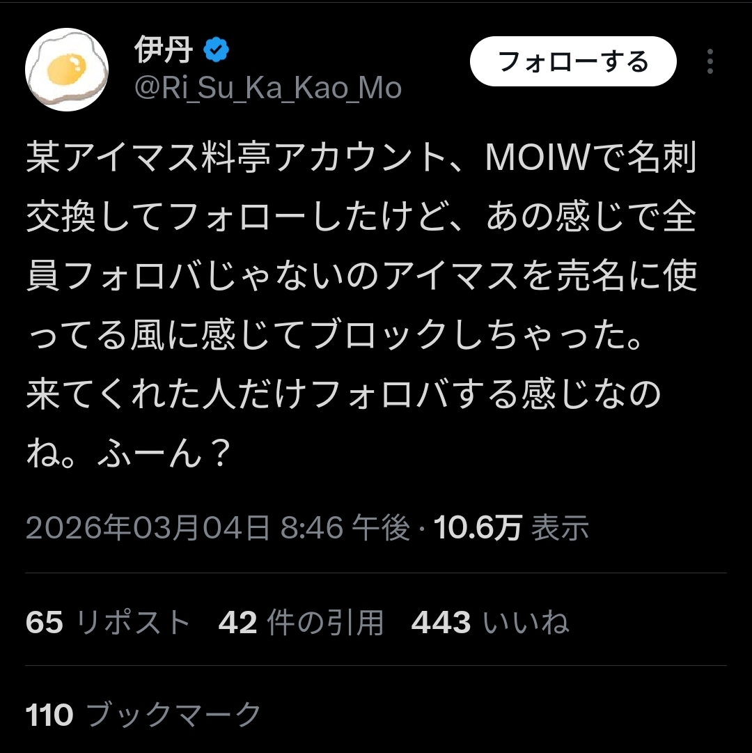 | … | 2726/03/05(木)09:30:15No.1407832730そうだねx17フォローもフォロバも自由だと思ってるけどあからさますぎるんだよなあの人は… |