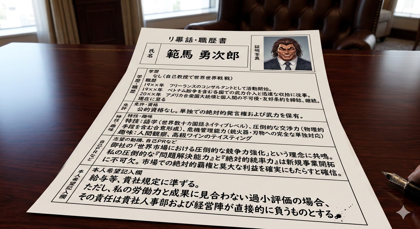| … | 10426/03/05(木)21:21:37No.1408003311そうだねx4俺も就職活動する勇次郎見てみたいからAIに書いてもらった |