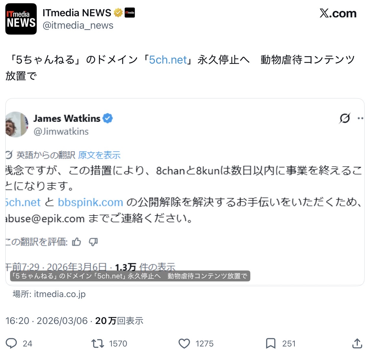 | … | 1626/03/06(金)18:41:02No.1408221517+既に5ch.oneに移ったそうで隔離場として機能してくれるそうな |