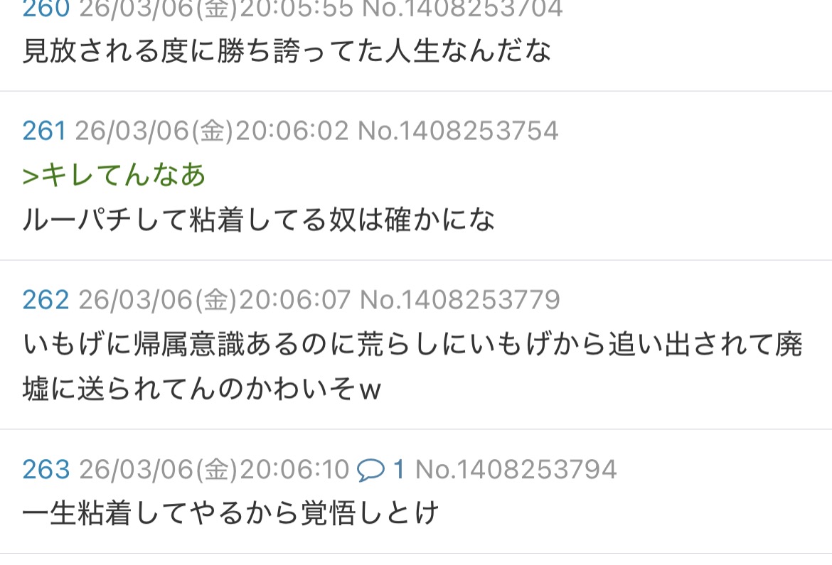 | … | 16026/03/06(金)20:48:05No.1408271381+あいもげスレ、荒らしにブチギレてた天然モノの「」ちゃんが湧くから面白いんだよな |