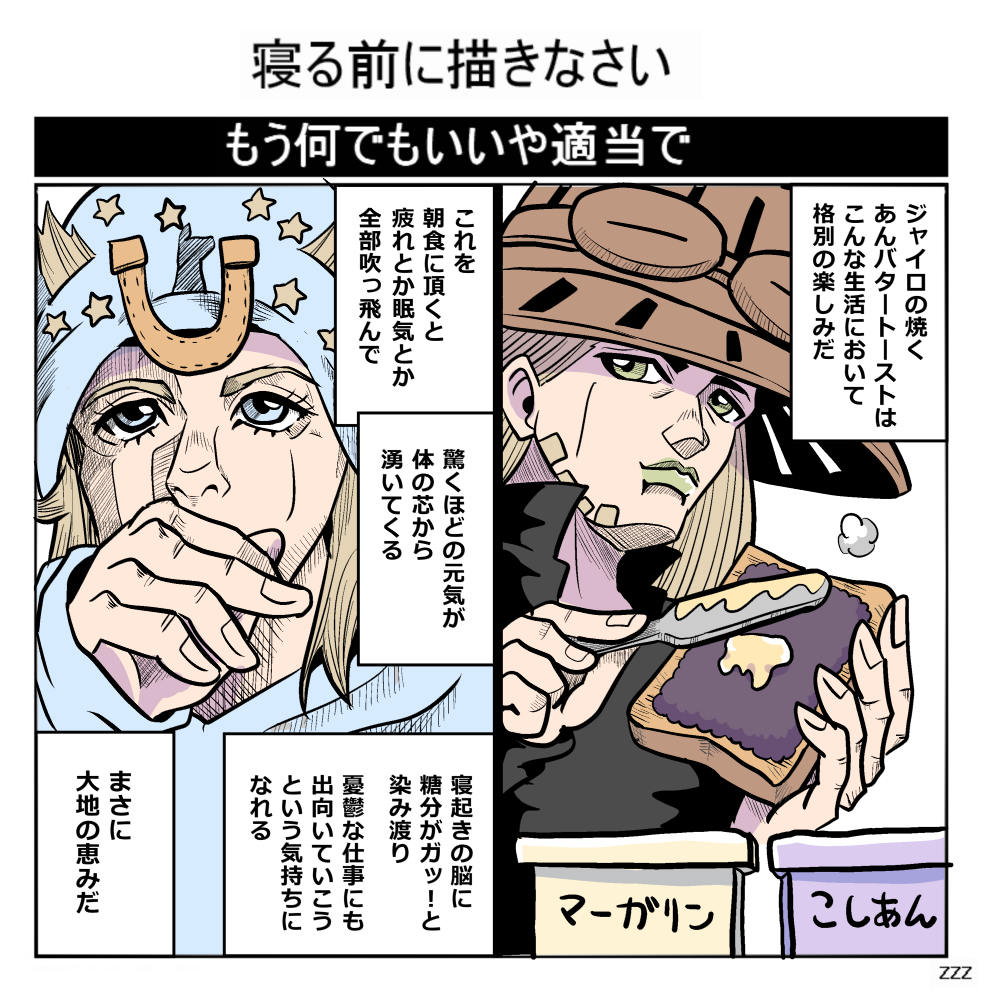 | … | 6726/03/06(金)20:36:59No.1408266832+あんバタートーストではなく「ジャイロのあんバタートースト」はマーガリンじゃなくっちゃあいけないんだッ!! |