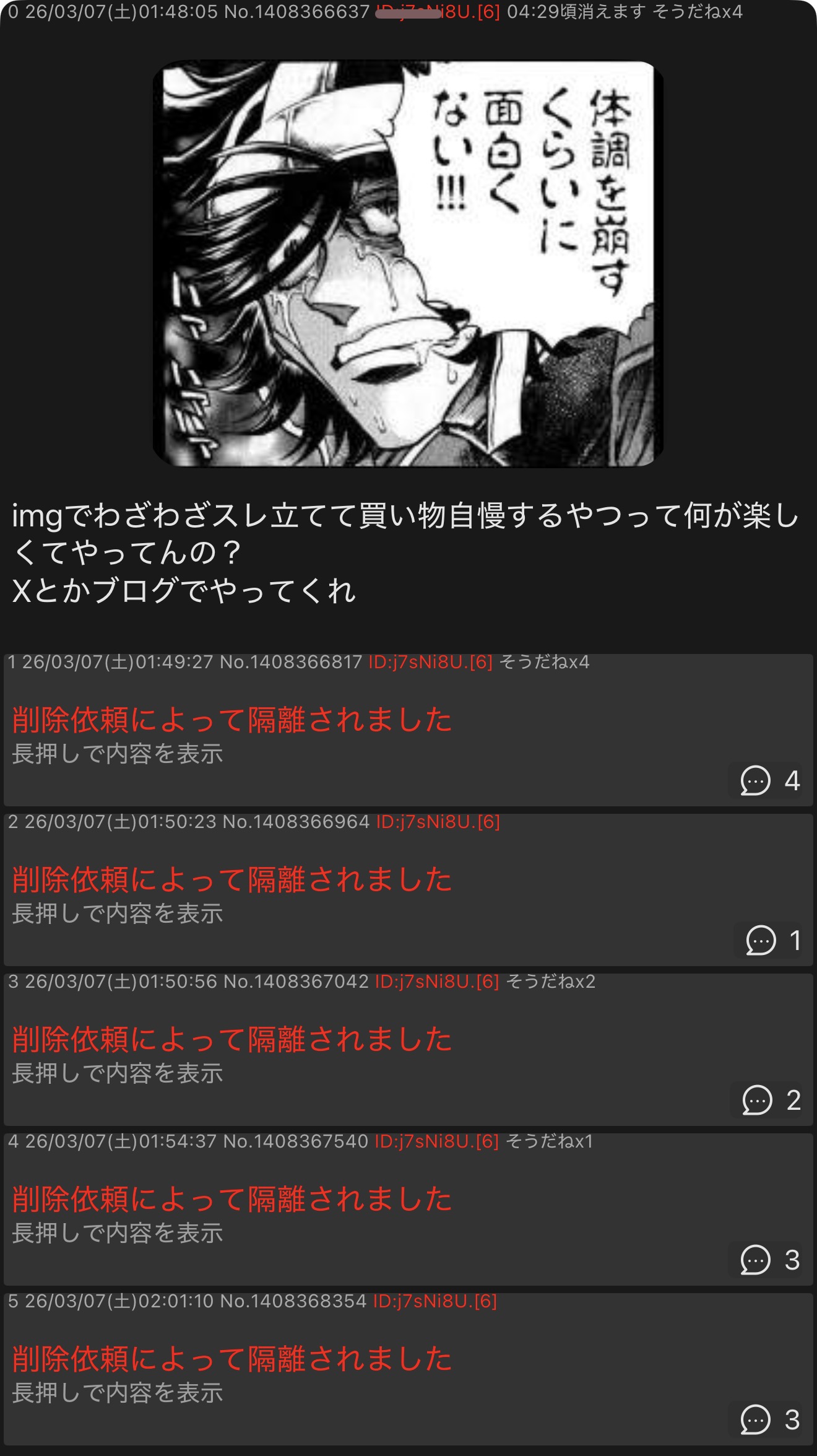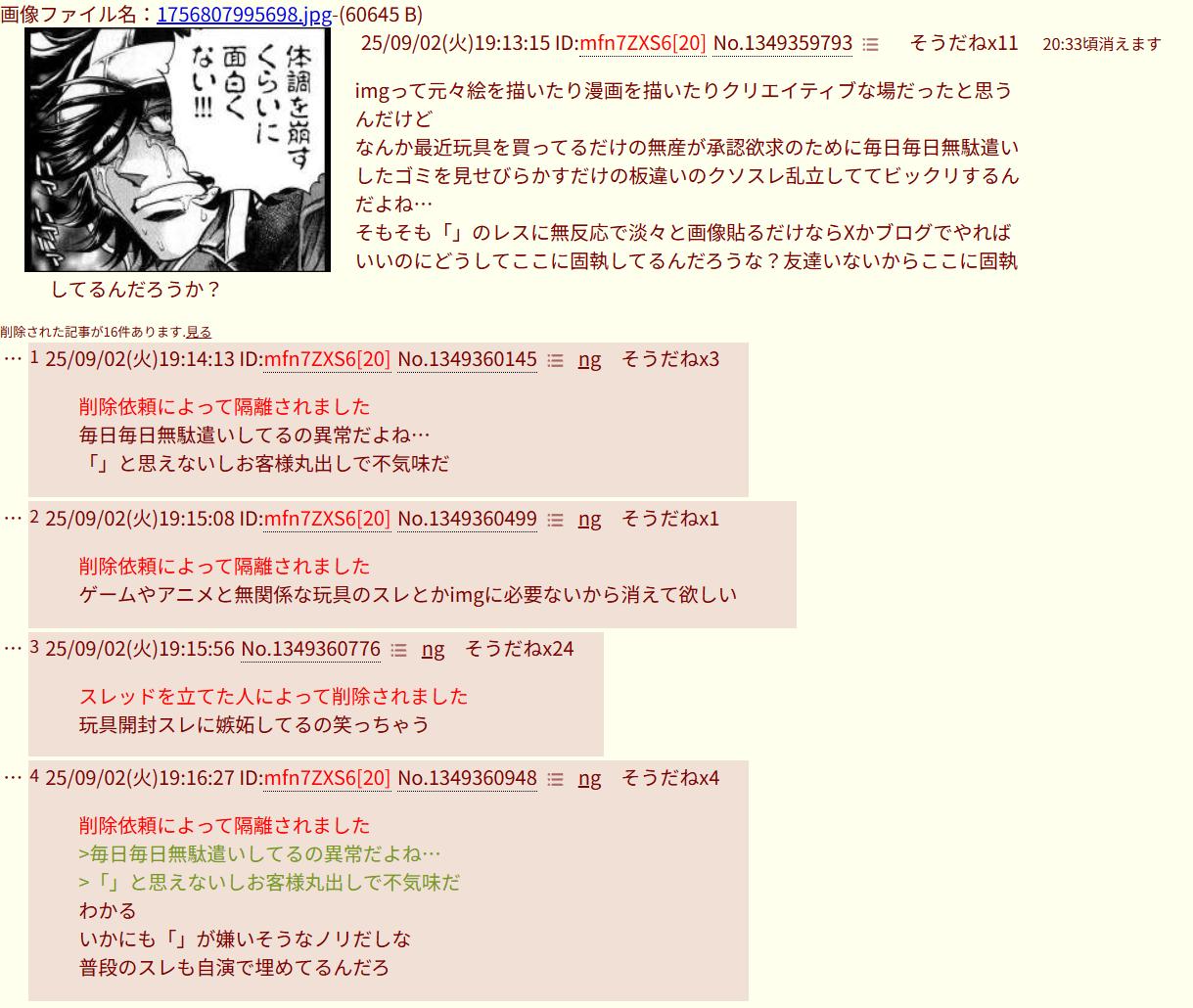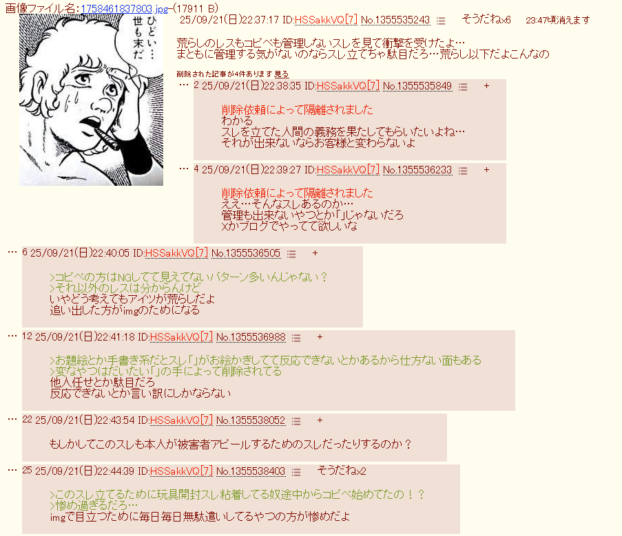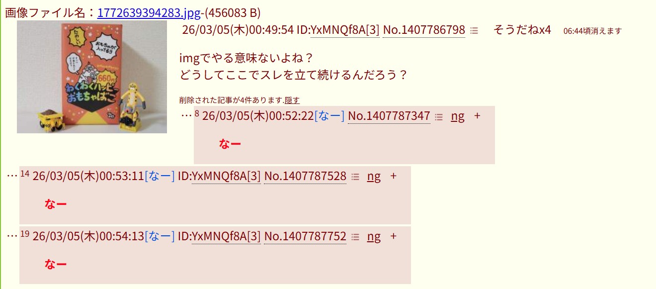 | … | 11226/03/07(土)02:30:50No.1408371358+あいもげの粘着は飽きて今度はこれかあ |