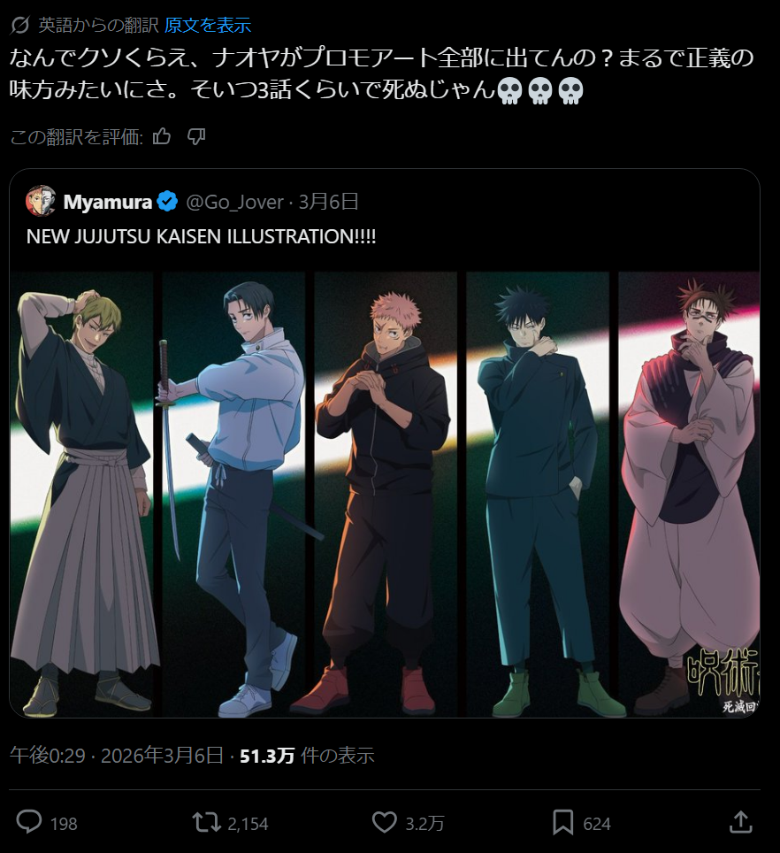 | … | 5426/03/07(土)14:38:03No.1408467251そうだねx7呪術スッキリやられてくれる悪役そんないないからな |