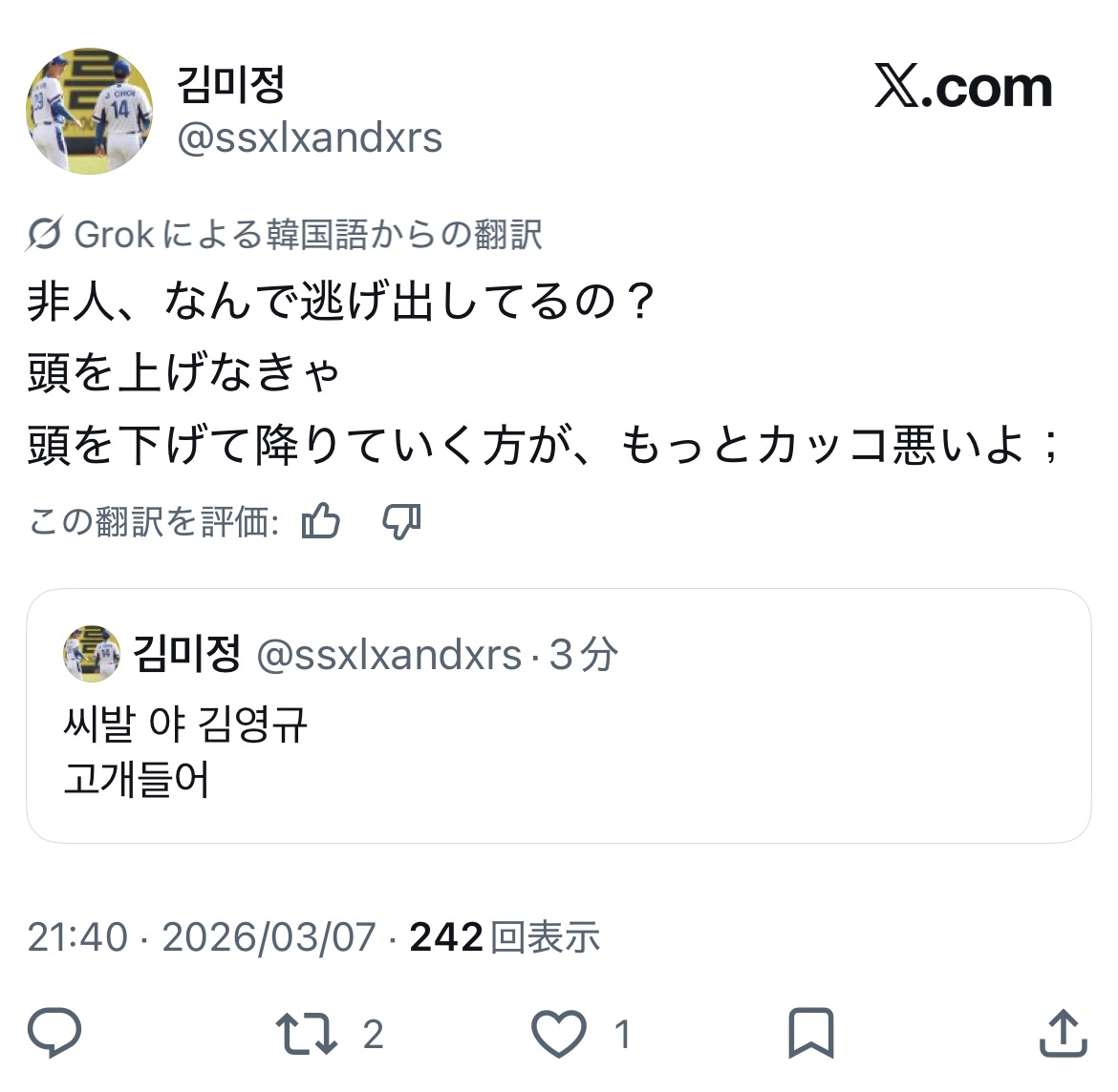 | … | 93226/03/07(土)21:57:37 ID:avw/4A.kNo.1408619085そうだねx1こいつ戦犯🐧👉️👤💦 |