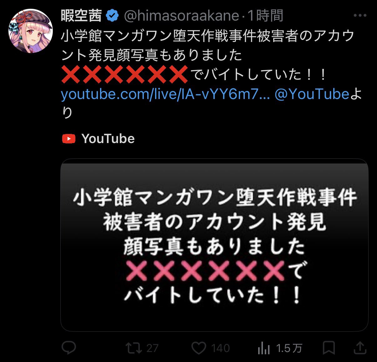 | … | 626/03/08(日)00:45:09No.1408682695そうだねx20小学館を表現の自由の為に守る!とか言ってたのは見たけどなんで被害者晒してるんだよ |