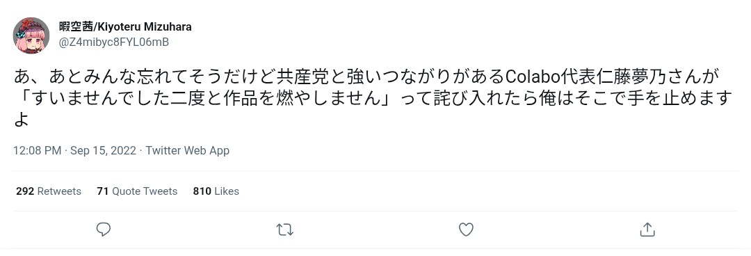 | … | 80926/03/08(日)02:23:50No.1408708438+>>>>小学館を表現の自由の為に守る!とか言ってたのは見たけどなんで被害者晒してるんだよ |