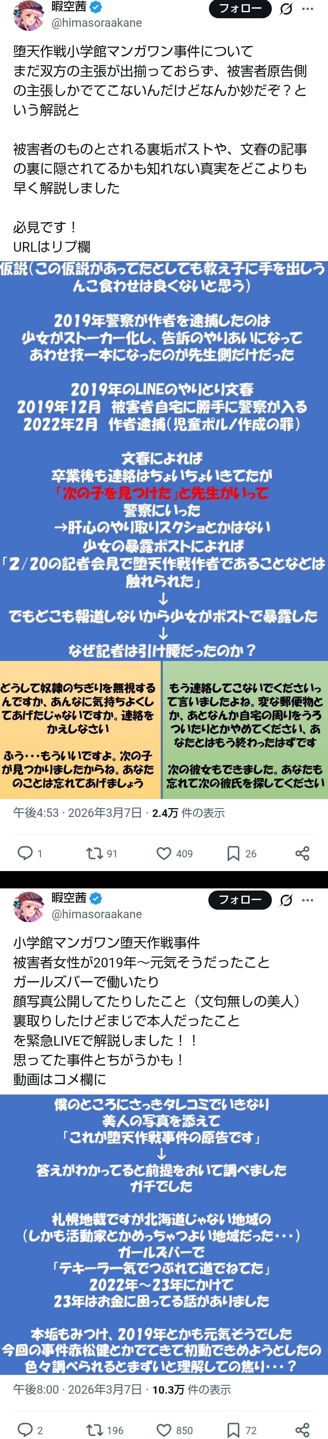 | … | 3826/03/08(日)00:54:52No.1408685307+小学館を叩くために被害者を晒すという勇気…! |