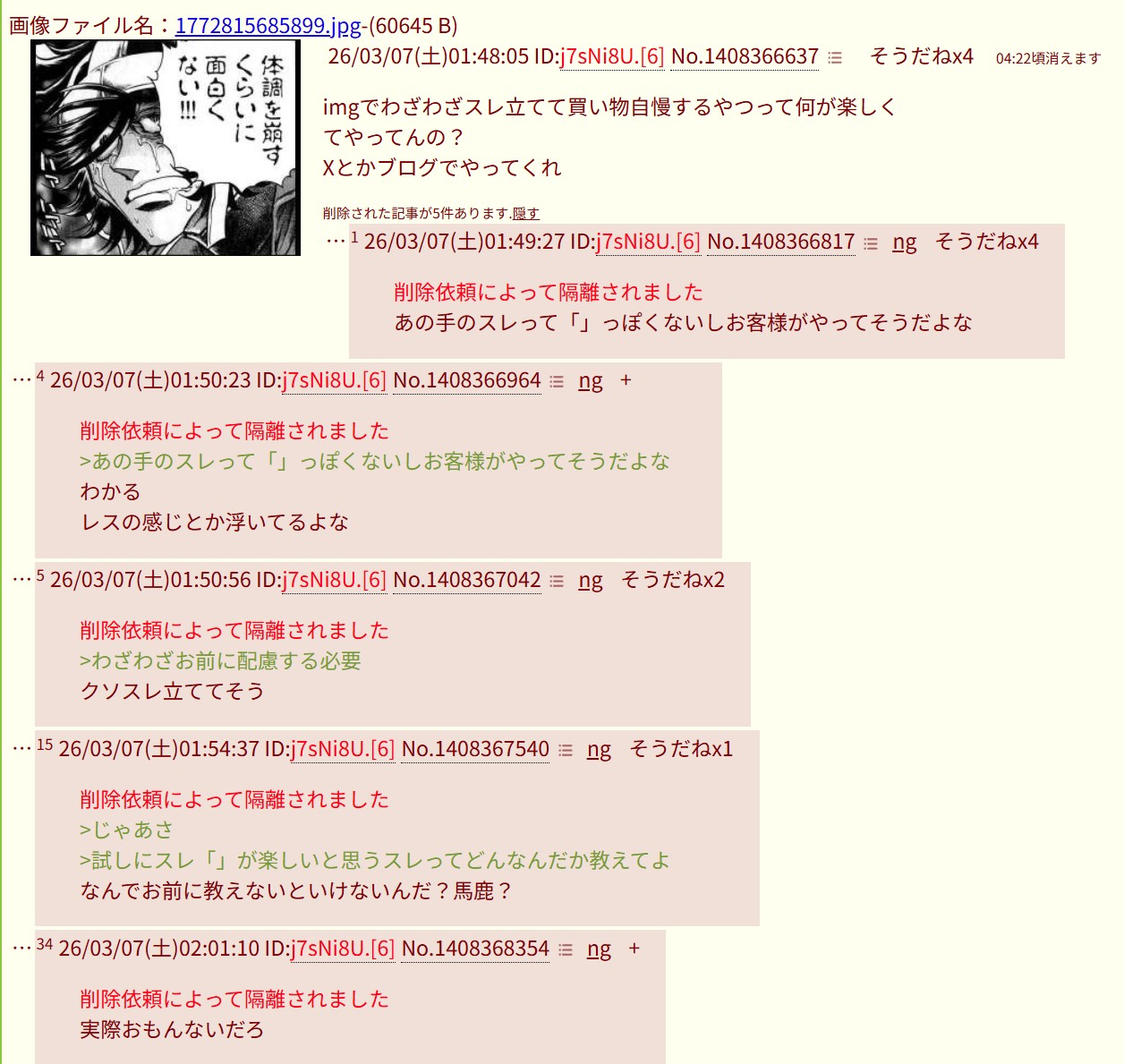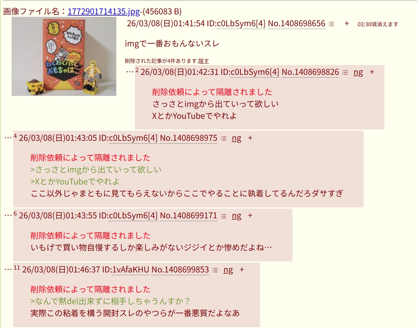 | … | 626/03/08(日)01:43:55 ID:c0LbSym6No.1408699171+削除依頼によって隔離されました |