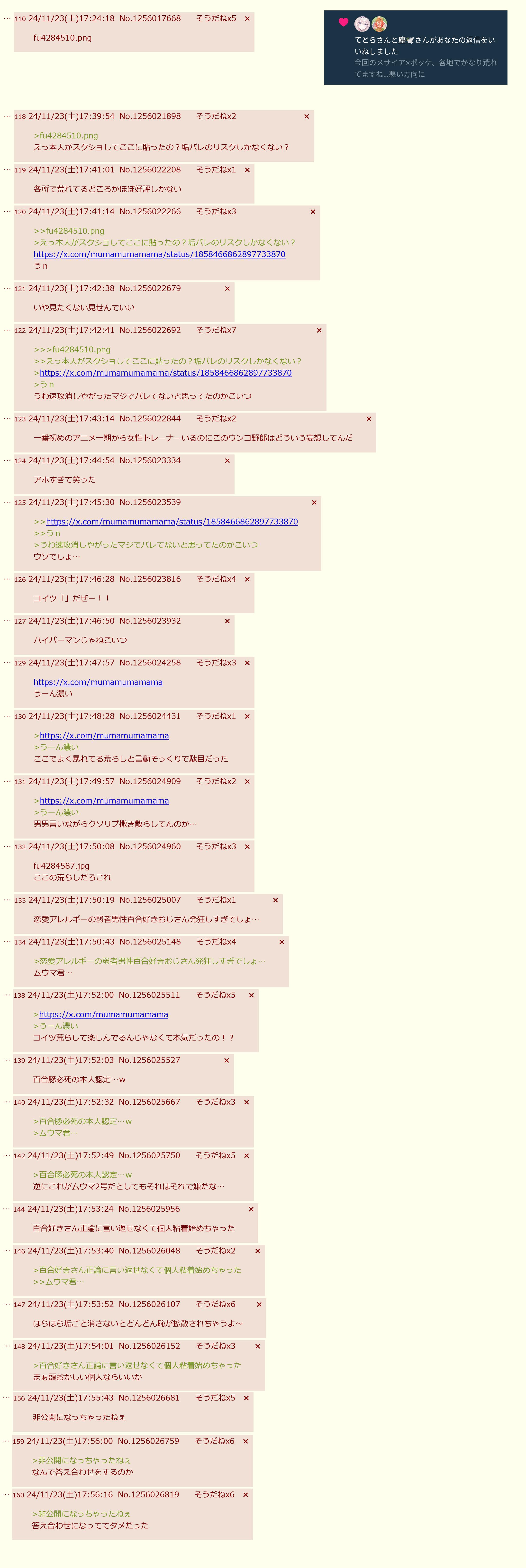 | … | 2526/03/08(日)06:32:20No.1408724224+ムウマ君自分のツイート載せたらそりゃバレるでしょ…アホかな |