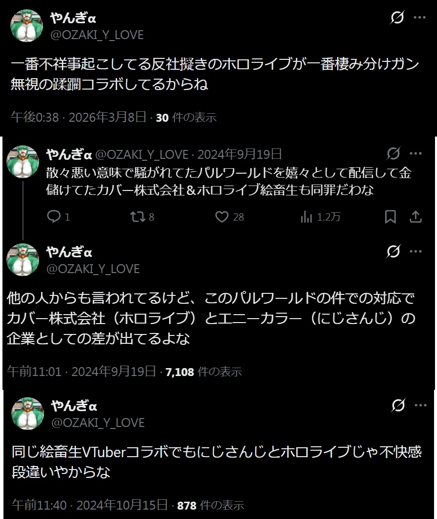 | … | 4026/03/08(日)14:14:50No.1408821882+>ホロ叩き以上ににじさんじを持ち上げる気持ちを抑えきれてないのが異常さに拍車を掛けてるな |