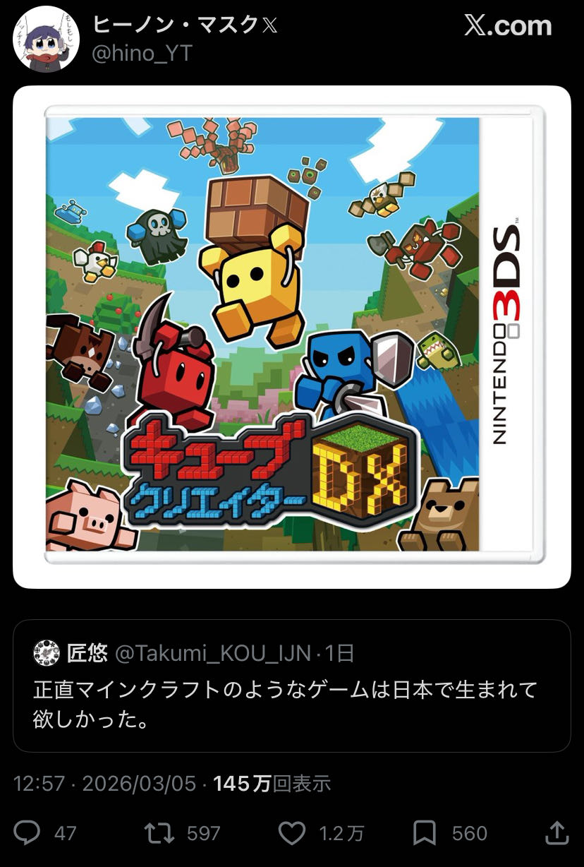 | … | 626/03/08(日)15:08:39No.1408837328そうだねx12何を指してマインクラフトのようなって言ってるのかわからないから無限に議論できるね |