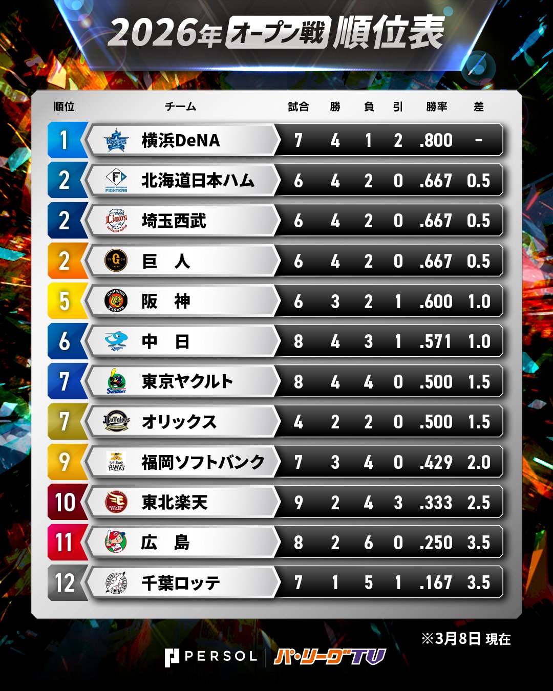 | … | 13626/03/08(日)17:35:57No.1408875494+>2024年は2勝9敗だったけど3位だしオープン戦の順位は気にしても仕方ないんですよ…! |