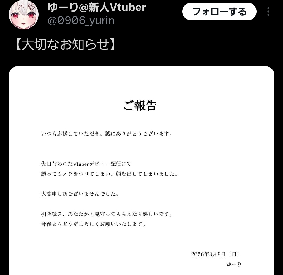 | … | 626/03/08(日)16:09:42 ID:4JmWHbWQNo.1408853323そうだねx4こういうの増えてるからVtuberとかいうのがどんどん虚像化してるな |