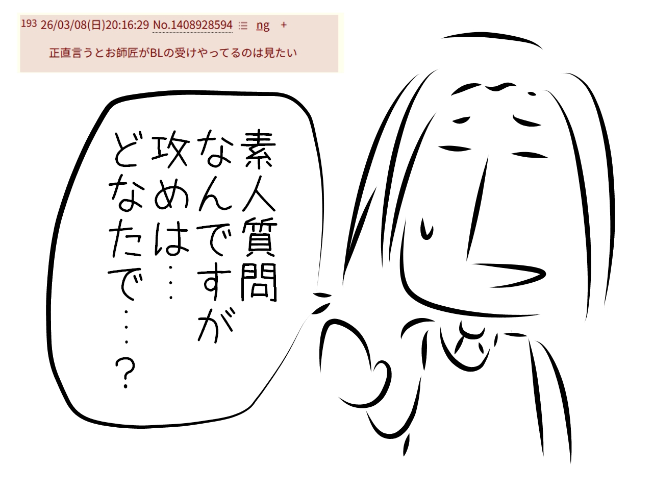 | … | 19326/03/08(日)20:16:29No.1408928594+正直言うとお師匠がBLの受けやってるのは見たい |