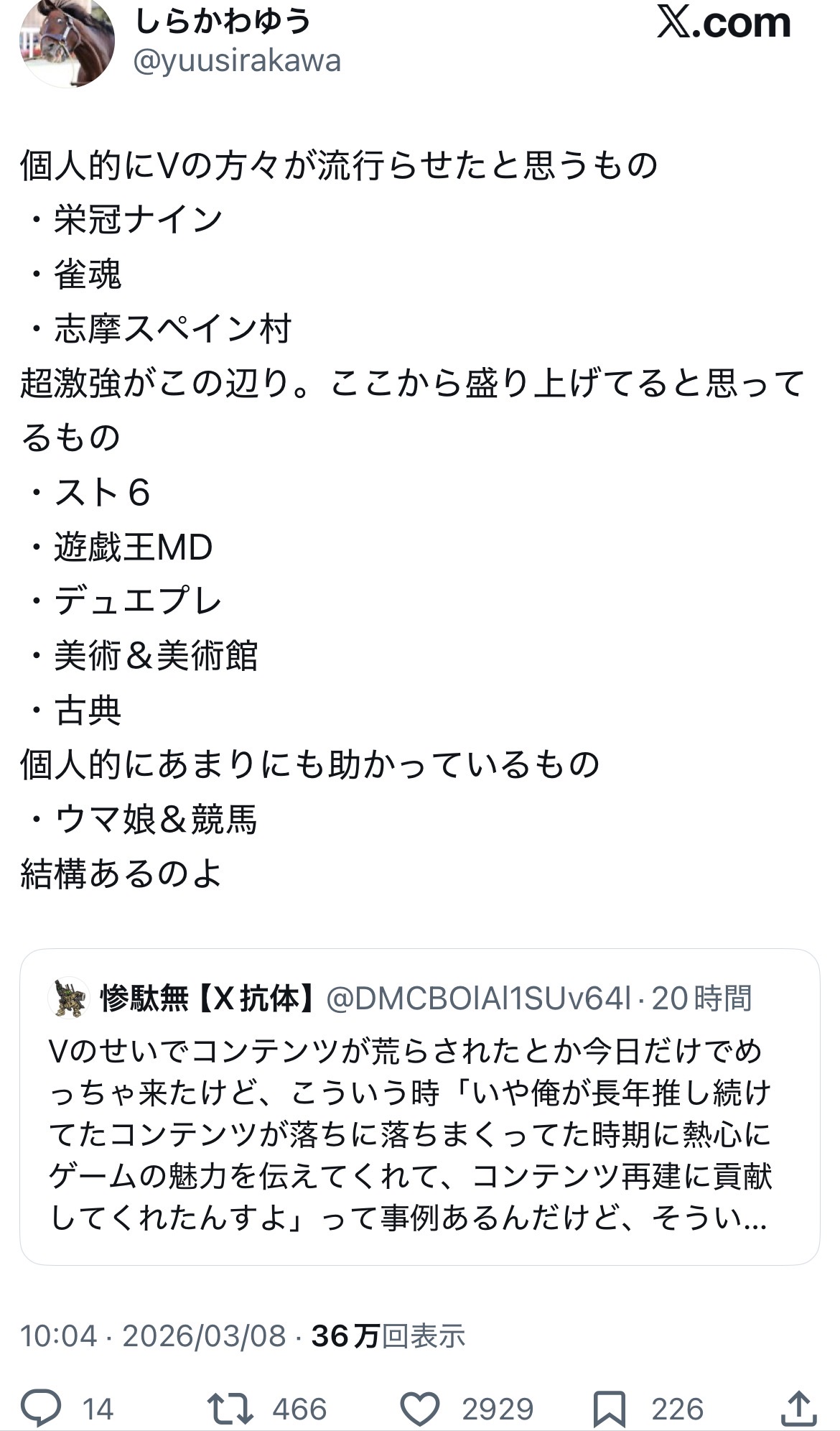 | … | 926/03/08(日)20:25:29No.1408932987そうだねx3ウマ娘に関してはVもある程度影響あるとは思うけど |