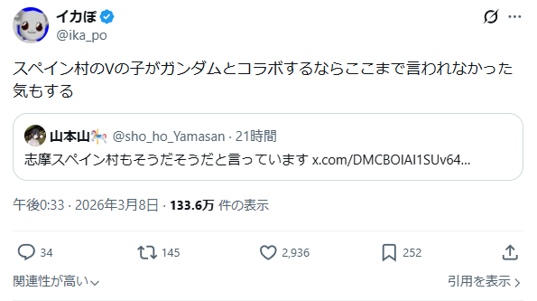 | … | 2026/03/08(日)20:30:12No.1408935033そうだねx1>スペイン村はサンゴ一人だったら永久コラボ狙えてたんじゃないかと思うくらい良好な関係だったよ |
