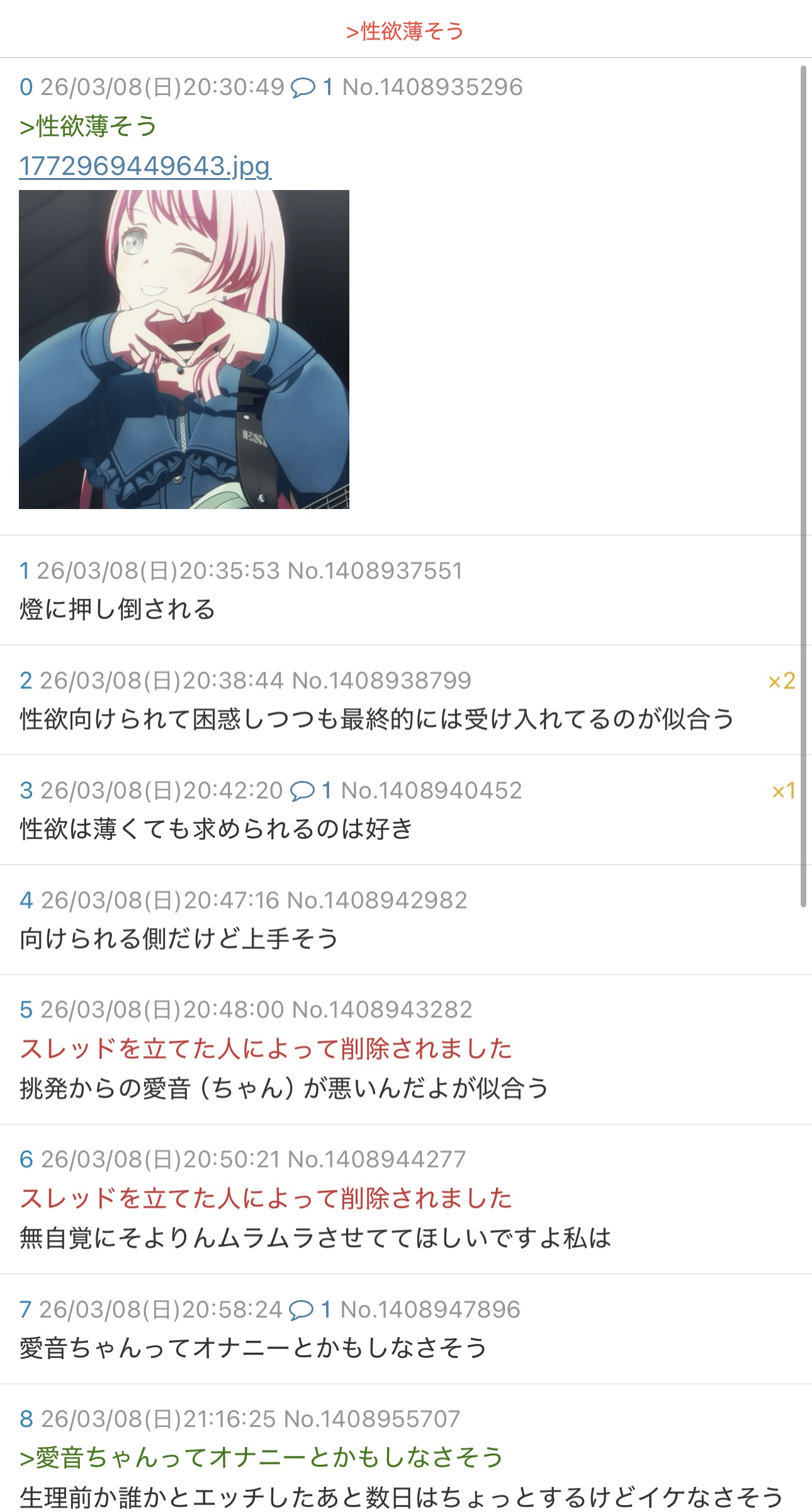 | … | 726/03/08(日)20:58:24No.1408947896+愛音ちゃんってオナニーとかもしなさそう |
