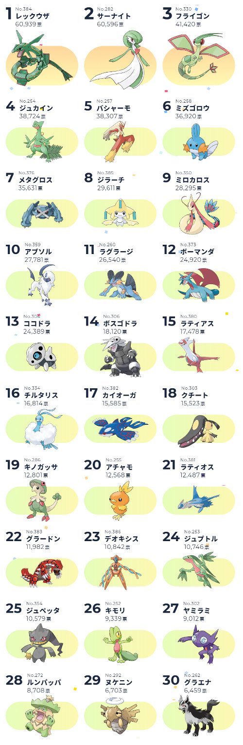 | … | 3526/03/08(日)21:22:50No.1408958414+>>ホウエン人気トップ3多分全部緑だから… |