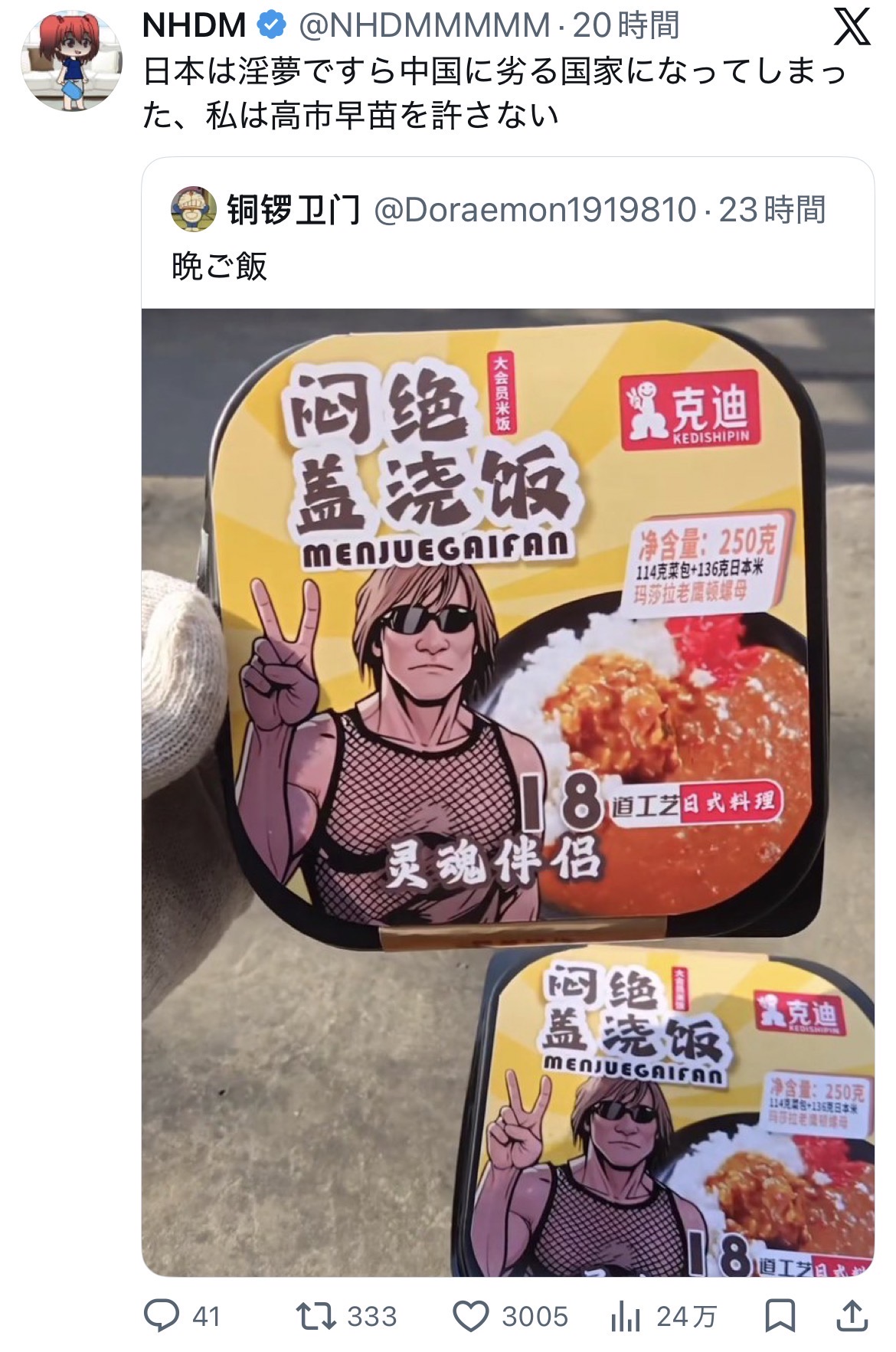 | … | 3026/03/08(日)21:37:29No.1408965345そうだねx2これ架空の食品パッケージ作るのが趣味の中国人じゃないの? |