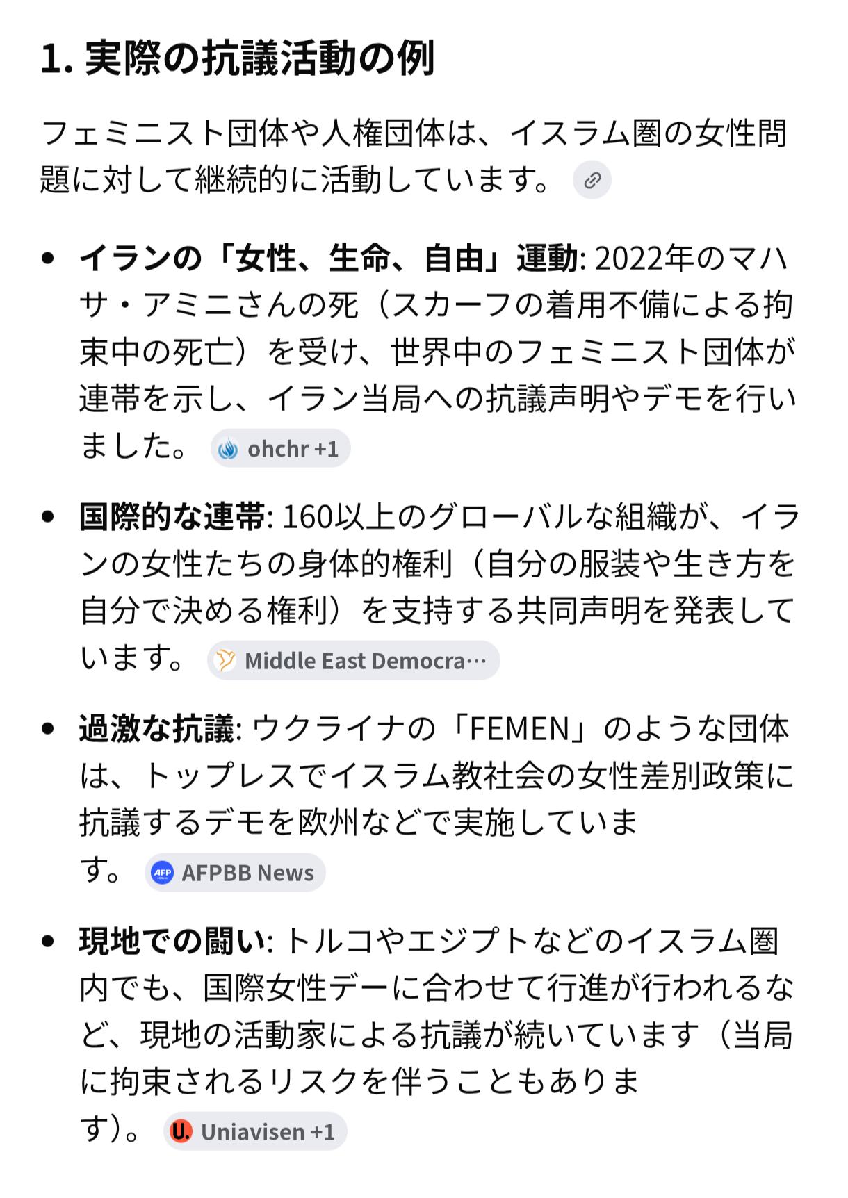 | … | 5826/03/09(月)00:06:33No.1409014354+>>そんな内政干渉って叫んでた奴もいるかもしれないけどフェミニストの人達が抗議してたって内容は具体的にはどんなの?そんな昔から活動してたの知ってるなら一つくらい出てくるよね? |