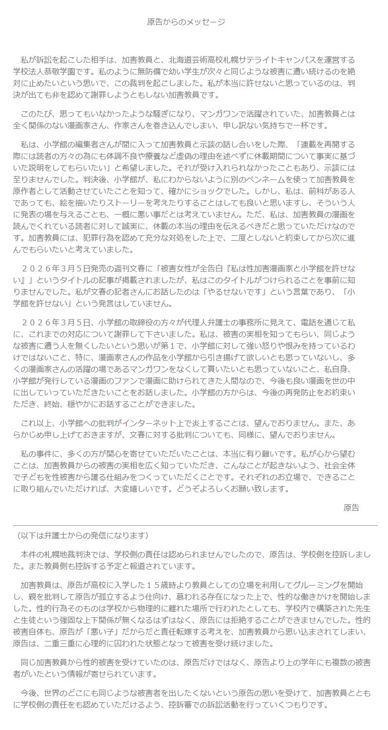 | … | 11526/03/09(月)15:30:36No.1409131886そうだねx1>直接会うのが本人に負担な場合もあるし今回に関して被害者側は小学館を責める意図はないし… |