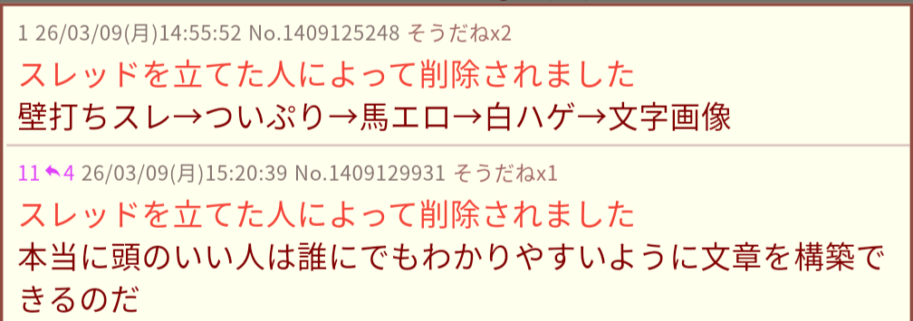 | … | 5226/03/09(月)16:15:19No.1409140682そうだねx1今消したレスみたいに |