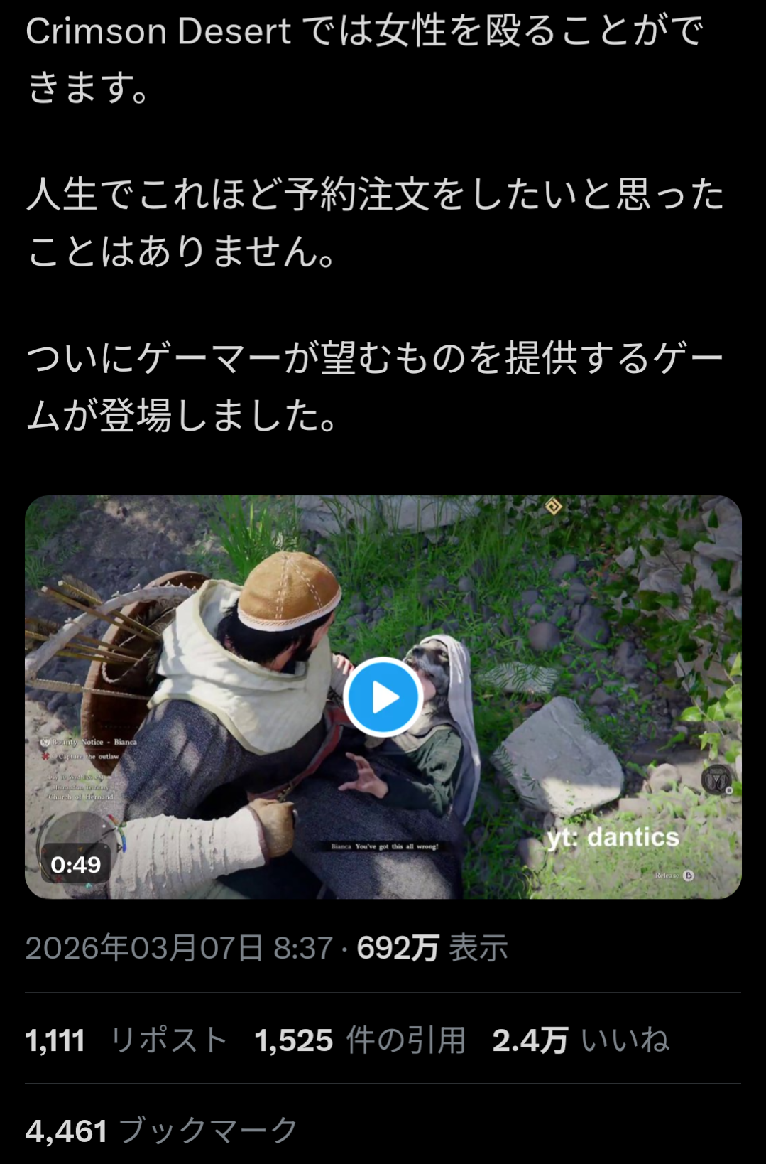 | … | 626/03/09(月)16:27:02No.1409142999そうだねx6>普通にゲーム内容気になるから予約してたのにこれじゃ女殴りたいみたいじゃん |