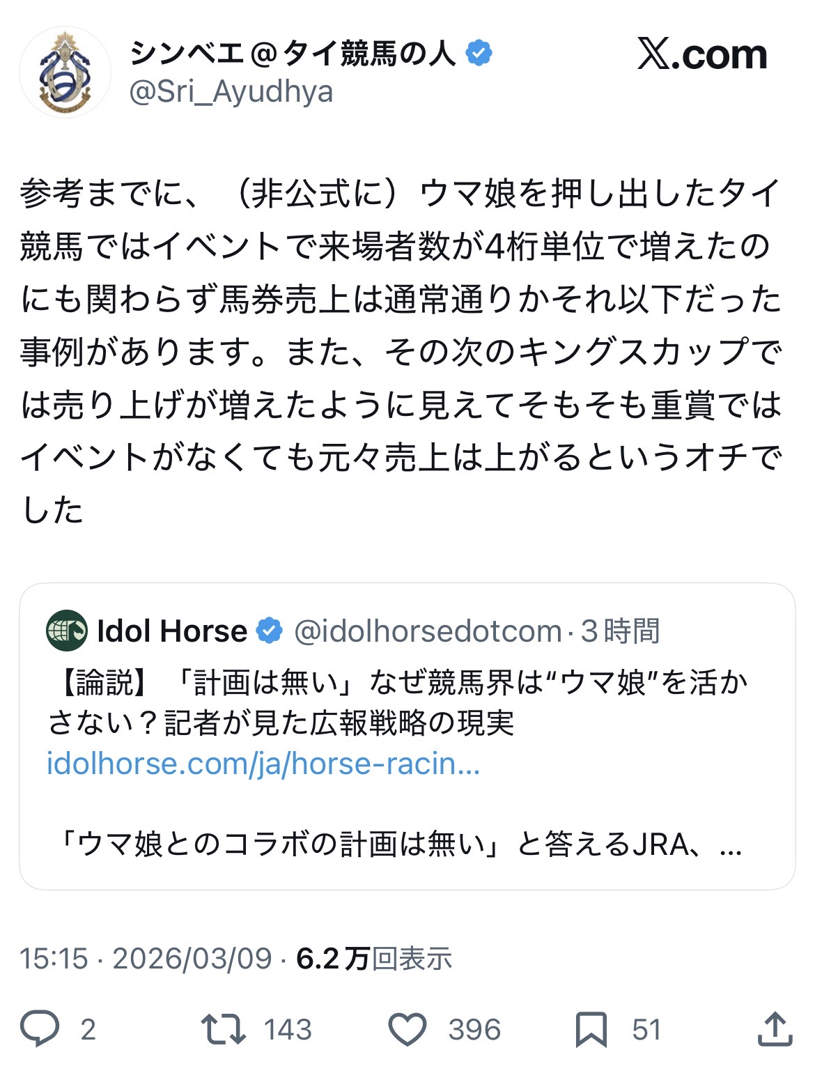| … | 16726/03/09(月)19:10:35No.1409182180+ウマ娘の影響自体は競馬関係者も口を揃えて言及してるから影響はあるんだよな |
