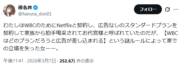 | … | 33426/03/09(月)19:24:26No.1409186579+>ひょっとしてアメリカのネトフリアカウントでアメリカのVPNを通してWBCを見たらCMなしだったりするのかな |